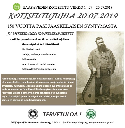 Kotiseutujuhla 150 vuotta Pasi Jääskeläisen syntymästä ja yhteislaulu kantelekonsertti 20.7. alk. klo 11:30